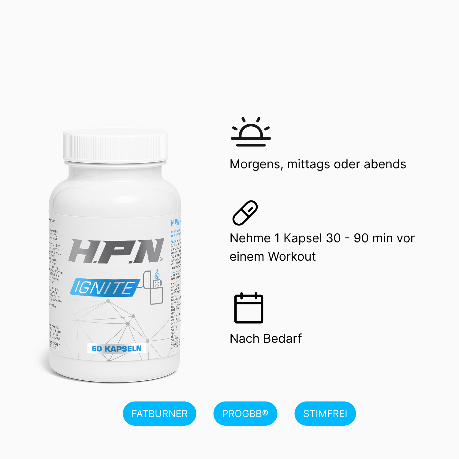 Wie jedes H.P.N Produkt ist auch Ignite so formuliert, dass er sich sinnvoll mit anderen H.P.N Produkten kombinieren lässt – zum Beispiel mit dem Heat als Alternative mit Koffein oder mit den Electrolytes, wenn du Mineralstoffe nach schweißtreibenden Einheiten auffüllen möchtest.